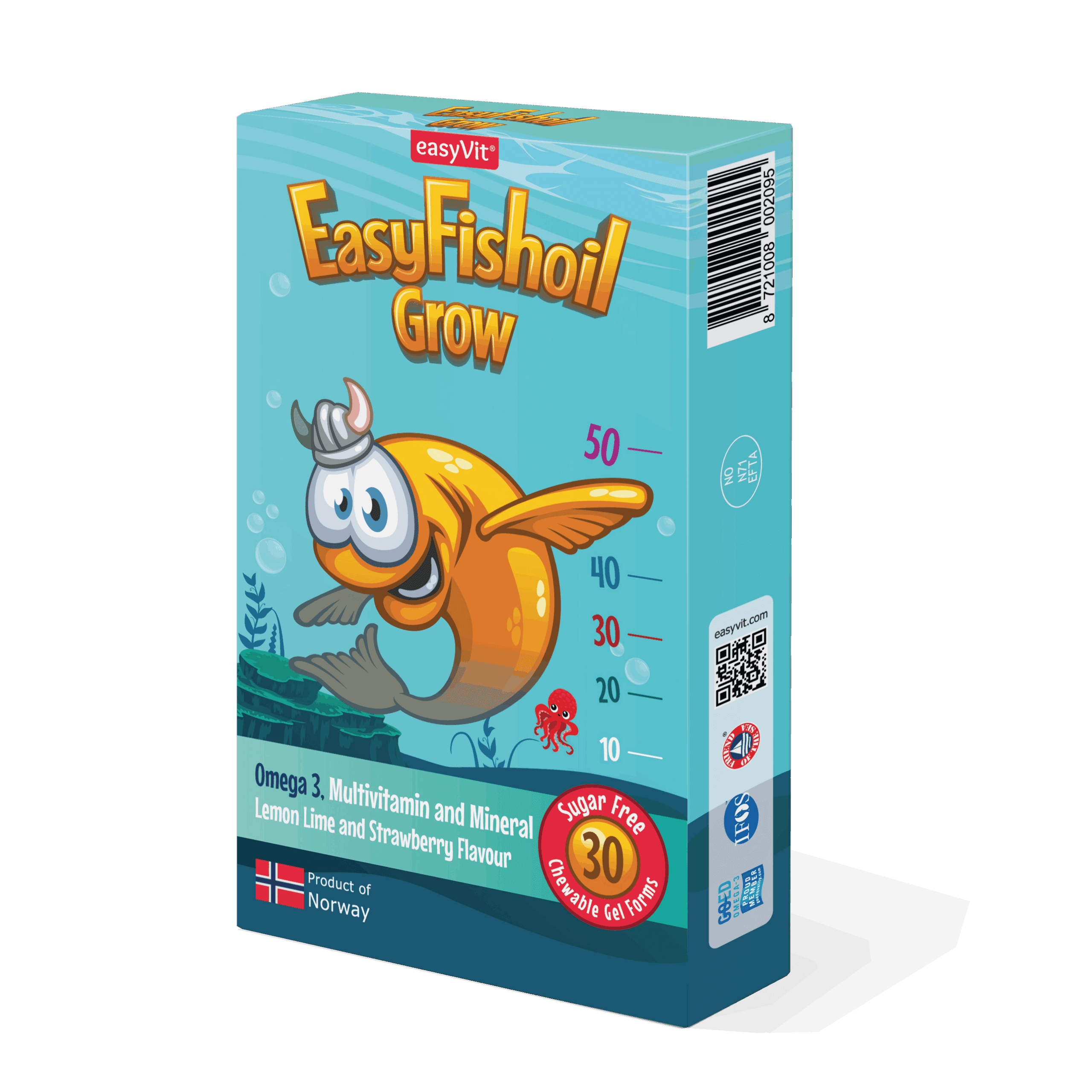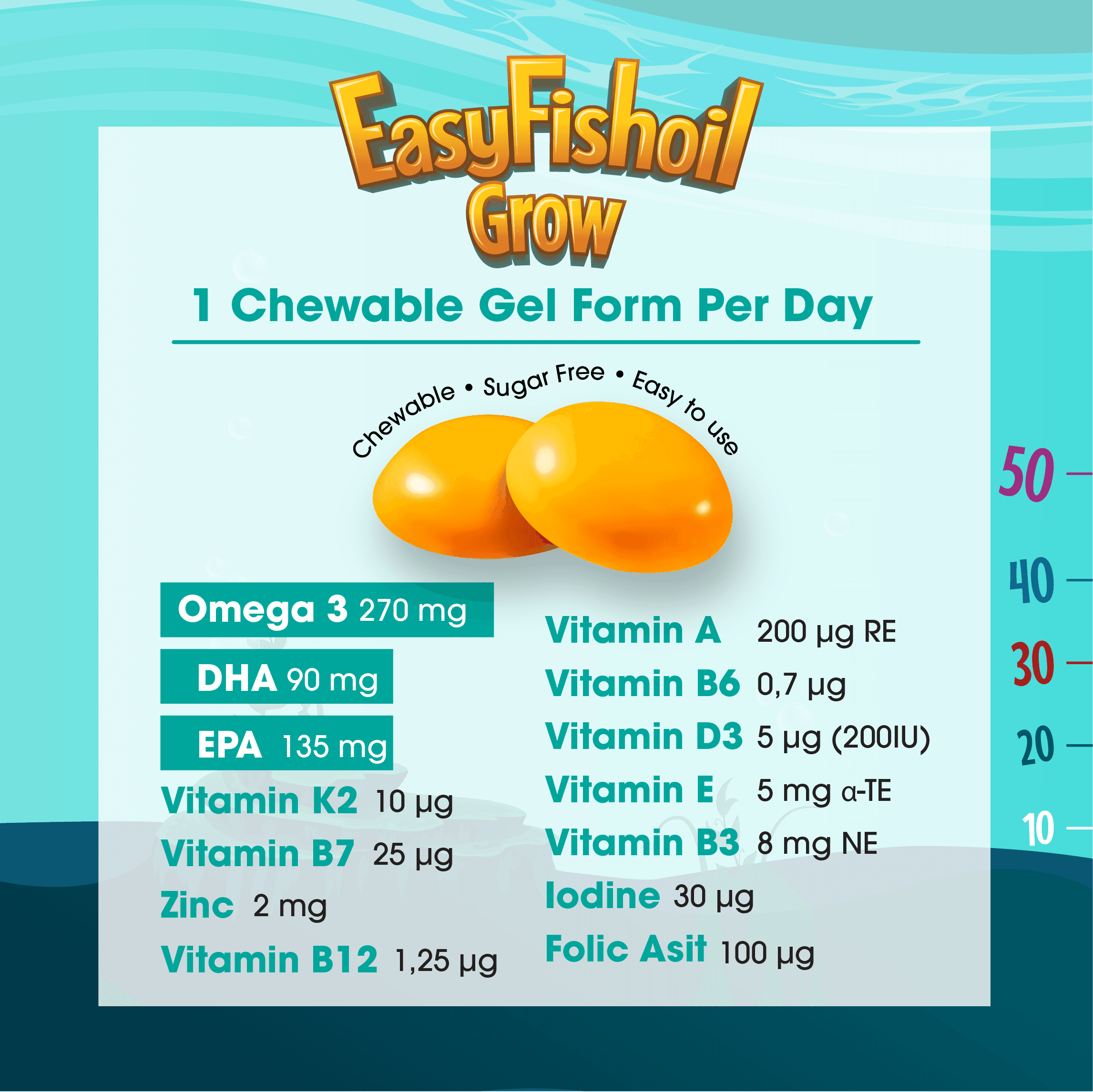 EasyFishoil Grow is a scientifically formulated chewable gel supplement designed to support the daily nutritional needs of children aged 3 and above. It combines Omega-3 fatty acids (EPA and DHA) with a broad spectrum of essential vitamins and minerals that contribute to healthy growth, immune support, cognitive development, and bone strength — all in a fruity, child-friendly format.